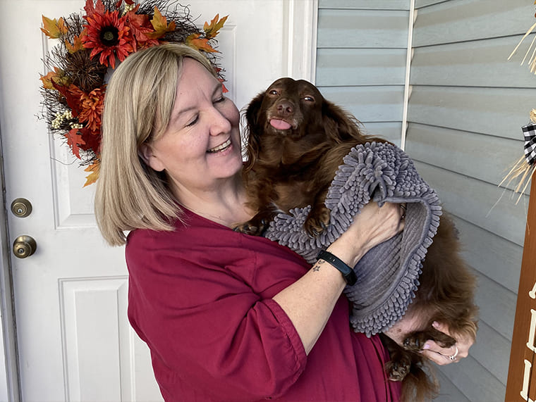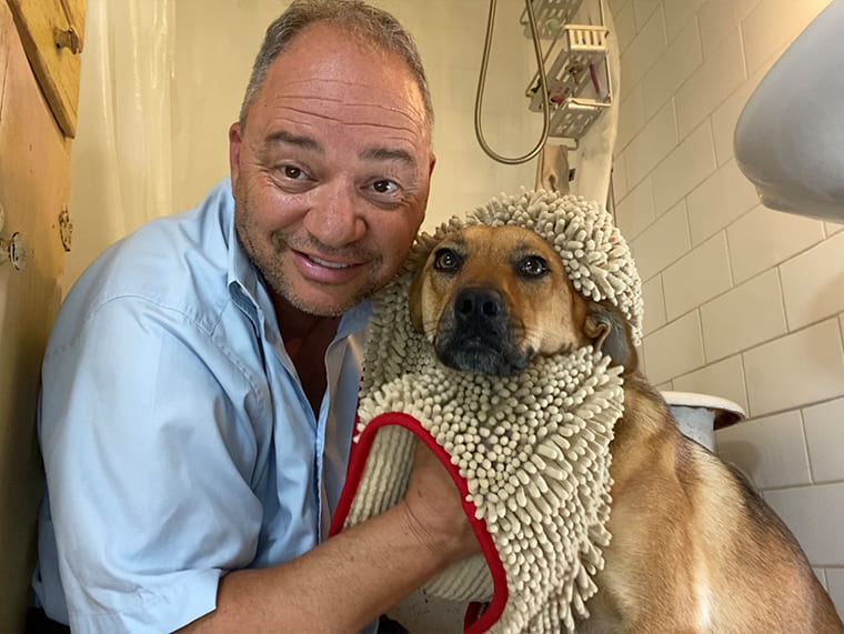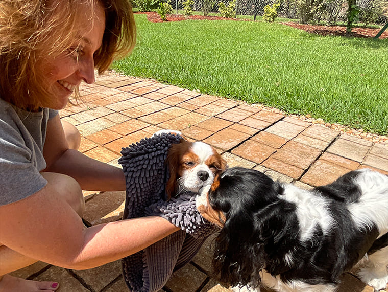 Here in FL almost every day there is a torrential downpour, sometimes catching little Duke out in the yard where he’ll come back in like he was just in the bath. Before the doggy dryer, he would bring the rain inside, and also all over myself as I would struggle to wrap him with a bath towel. With the shammy, it keeps my hands dry with the nice hand pockets, and he dives right into the field of softness as I like to call it. I think I might enjoy this thing more than Duke does!