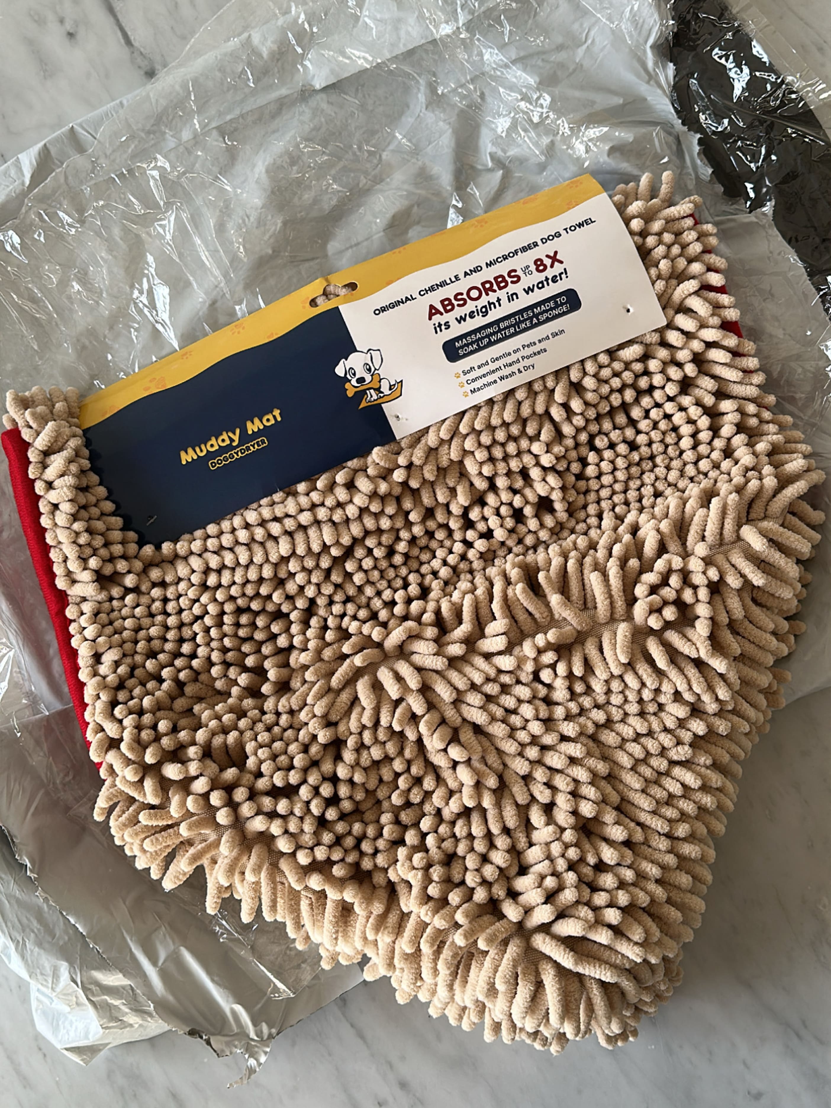 I wish I knew about this years ago, this would’ve saved me so many hours of cleaning mud and water off the floor. I bought the Original Muddy Mat on Amazon, and saw they released a towel made from the same material! I have a 112 pound Malenoi and I trained her to sit on the mat while I use the doggy dryer to take care of any dripping areas!