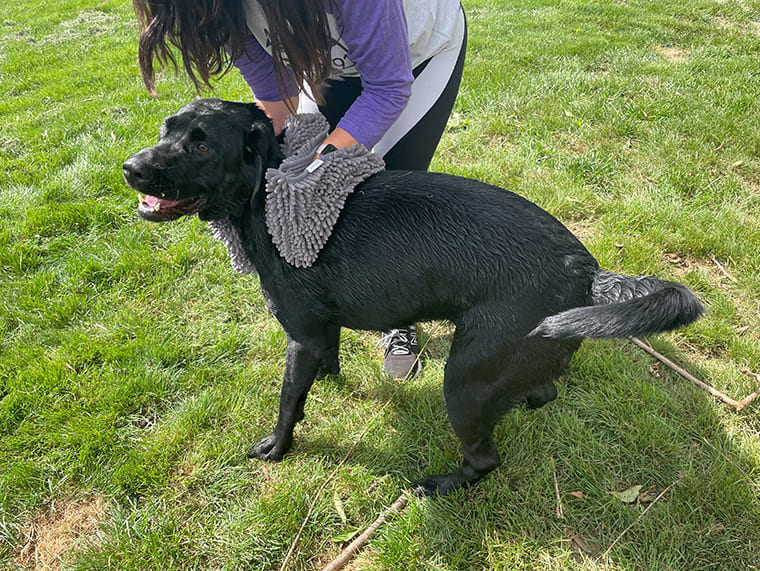 Before buying this I would keep one or two bath towels by the back entrance just in case there was a rainy day. These shammies are so much better than the simple towels at soaking up moisture, I no longer had a need for the towels there. It’s been a few rain and lightning storms and this is really great for handling fully soaked dogs. I put my hands in the cute hand holders, and it’s super easy wrapping my pups in the shammy, fully drying them, these are really the best